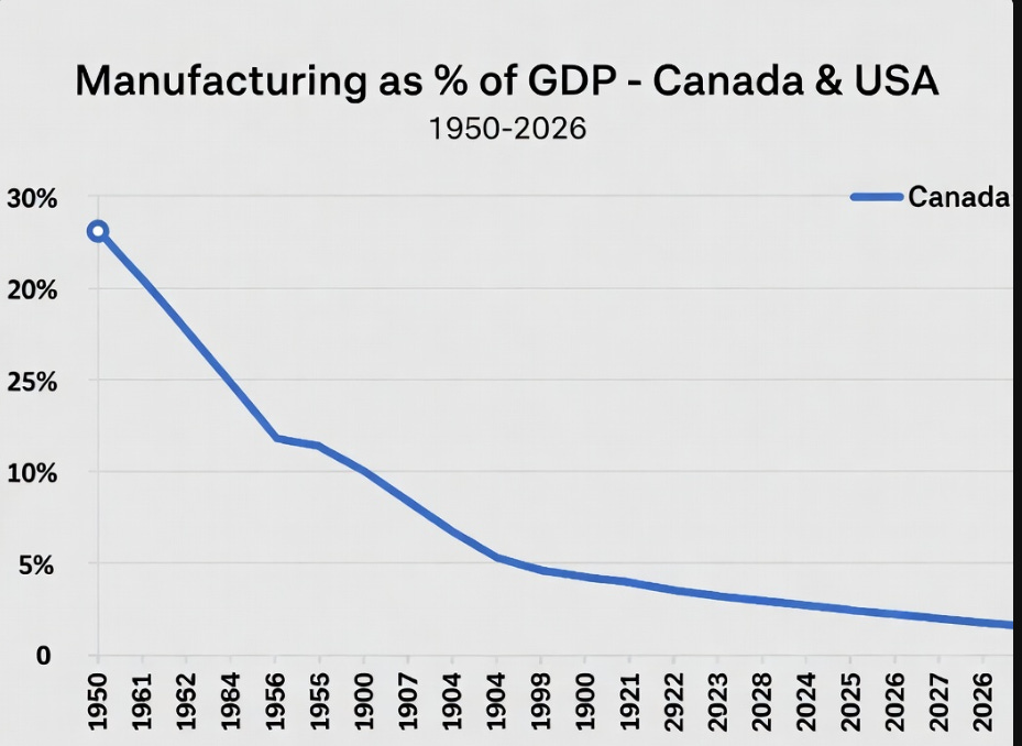 The result? Our manufacturing share of the economy collapsed from the 25% I remember as a young man to barely 10% today. We became dependent on foreign labour, foreign resources, and — as we admitted in the first piece — too often foreign graves to keep the petro-dollar system running.